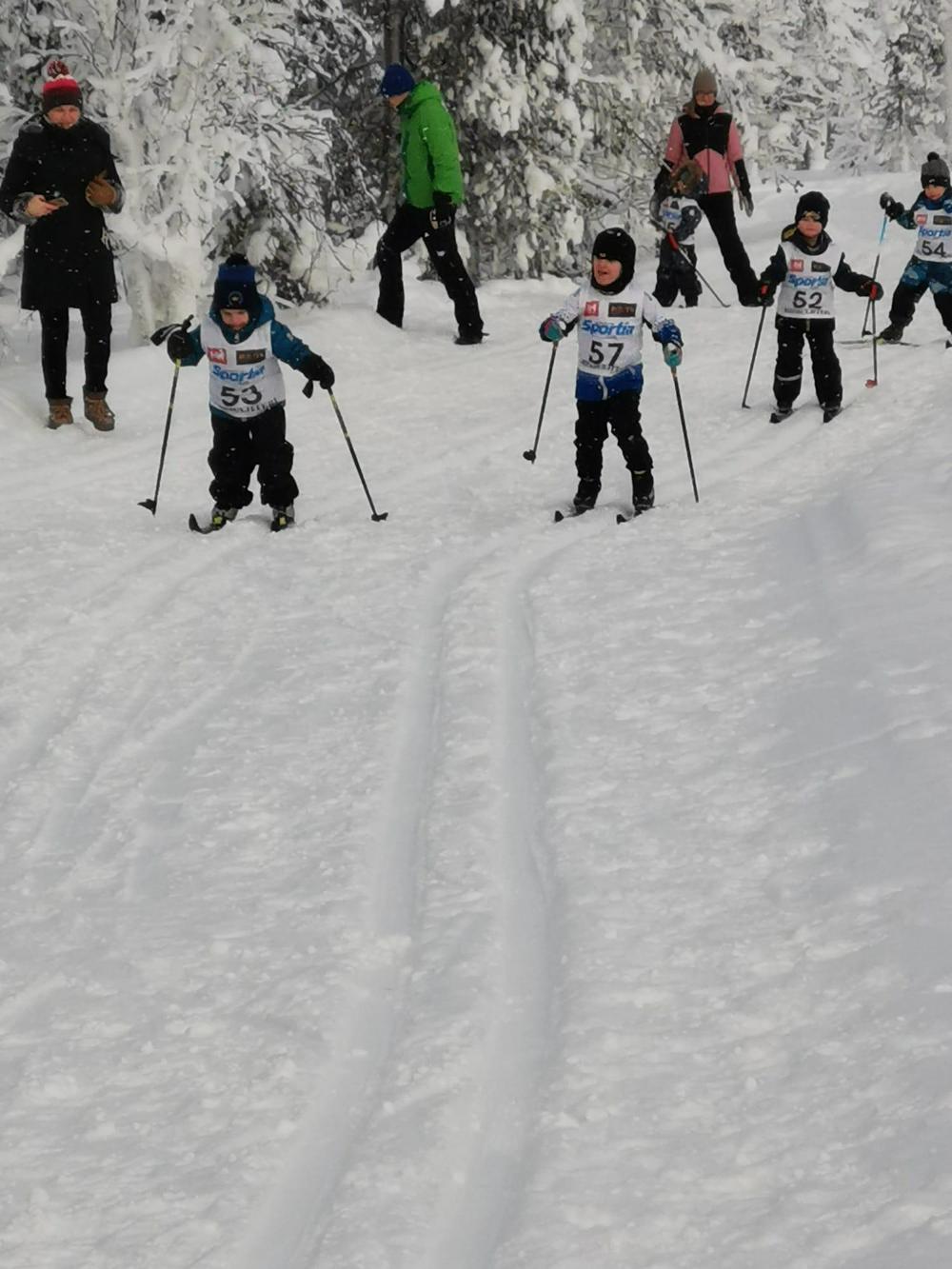 Ensimmäisinä starttasivat 100 metrin matkalle alle neljävuotiaat pojat, ja kultamitalitaisto oli tiukka. Sarjan voitti Artturi Vuorio vain kahden sekunnin erolla Niila Valtamäkeen. Alle neljävuotiaiden tyttöjen sarjassa oli vain kaksi hiihtäjää, jotka molemmat palkittiin mitaleilla. Eniten lähtijöitä, 18, keräsi alle kuusivuotiaiden poikien sarja, jonka voitti numerolla 57 hiihtänyt Martti Kivelä. Osallistujamäärältään hyvänä kakkosena oli tytöt alle 8 vuotta, jossa hiihti 16 kilpailijaa.