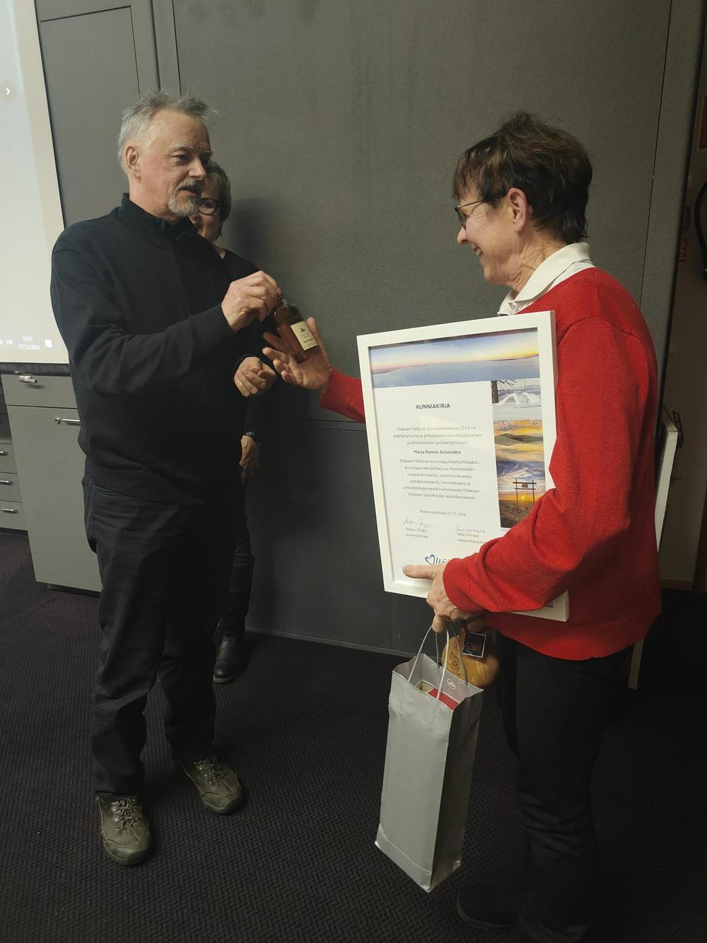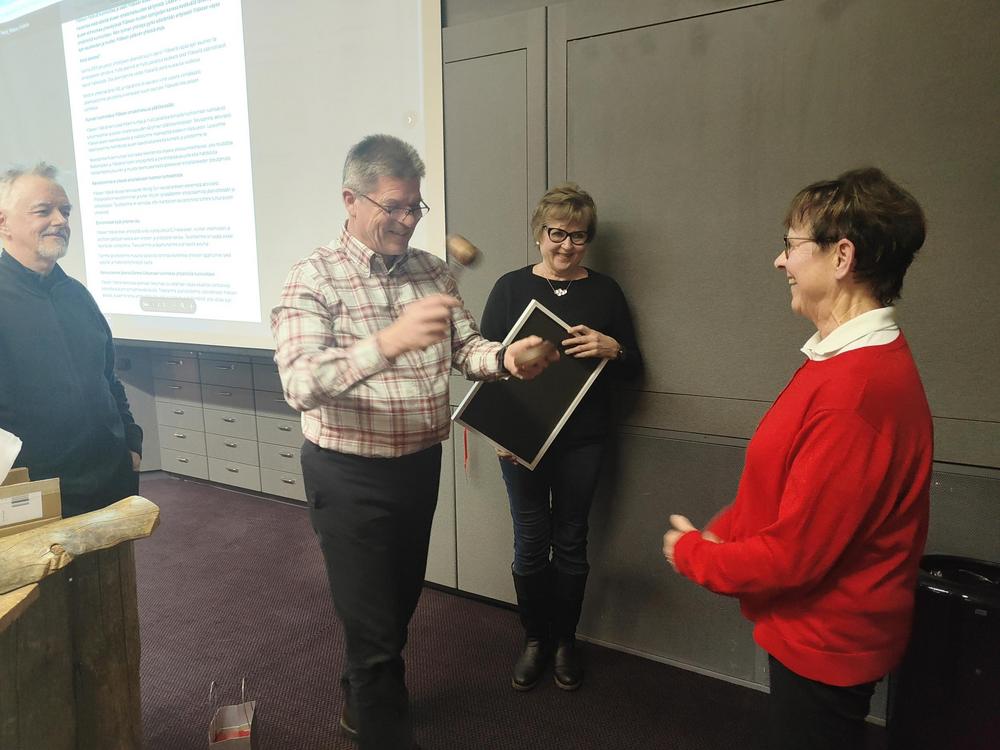 Marja Ramm-Schmidt kiitti tilaisuudessa lämpimästi puolisoaan Leif Ramm-Schmidtia yhdistyksen toiminnan eteenpäin viemisessä. Myös Leif on yksi perustajajäsenistä, ja hänen väsymätön asiantuntijatyönsä Hannukaisen kaivoshankkeessa on ollut paitsi yhdistykselle myös kaikille alueen luontoarvoja puolustaville mittaamattoman arvokasta.