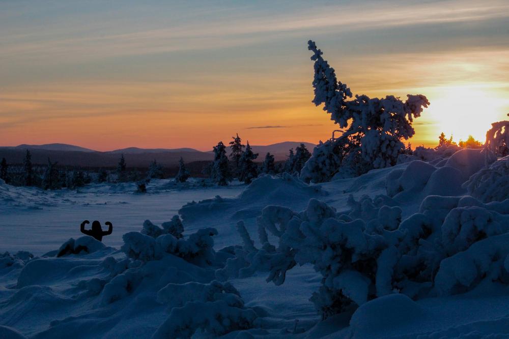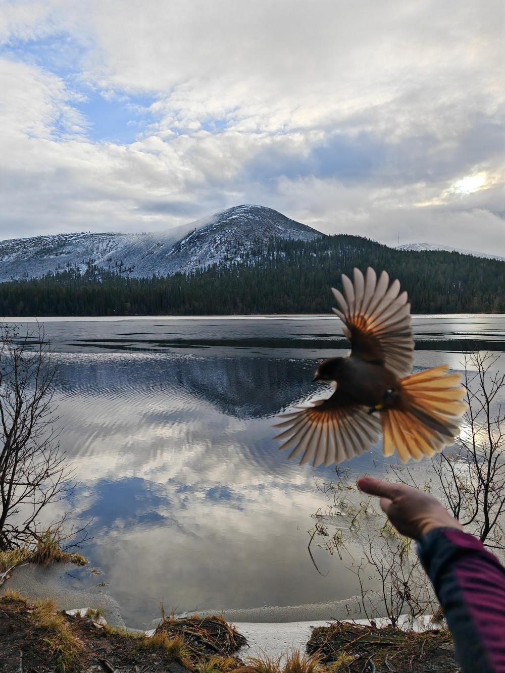 "Oli pilvinen päivä ja lähdimme siskon kanssa kävelemään Kesängille. Sitten aurinko pilkahtikin pilvien välistä ja menimme järven rantaan. Siihen lensi sitten jostain iso parvi kuukkeleita. Hyviä kuvia tuli paljon", kertoo Katja. Entisenä kilpahiihtäjänä hän löysi Ylläksen ladut jo varhain ja pitää Yllästä maan hiihtokeskuksista ykkösenä. "Latuverkosto ja varsinkin maisemat ovat ihan parhaat".